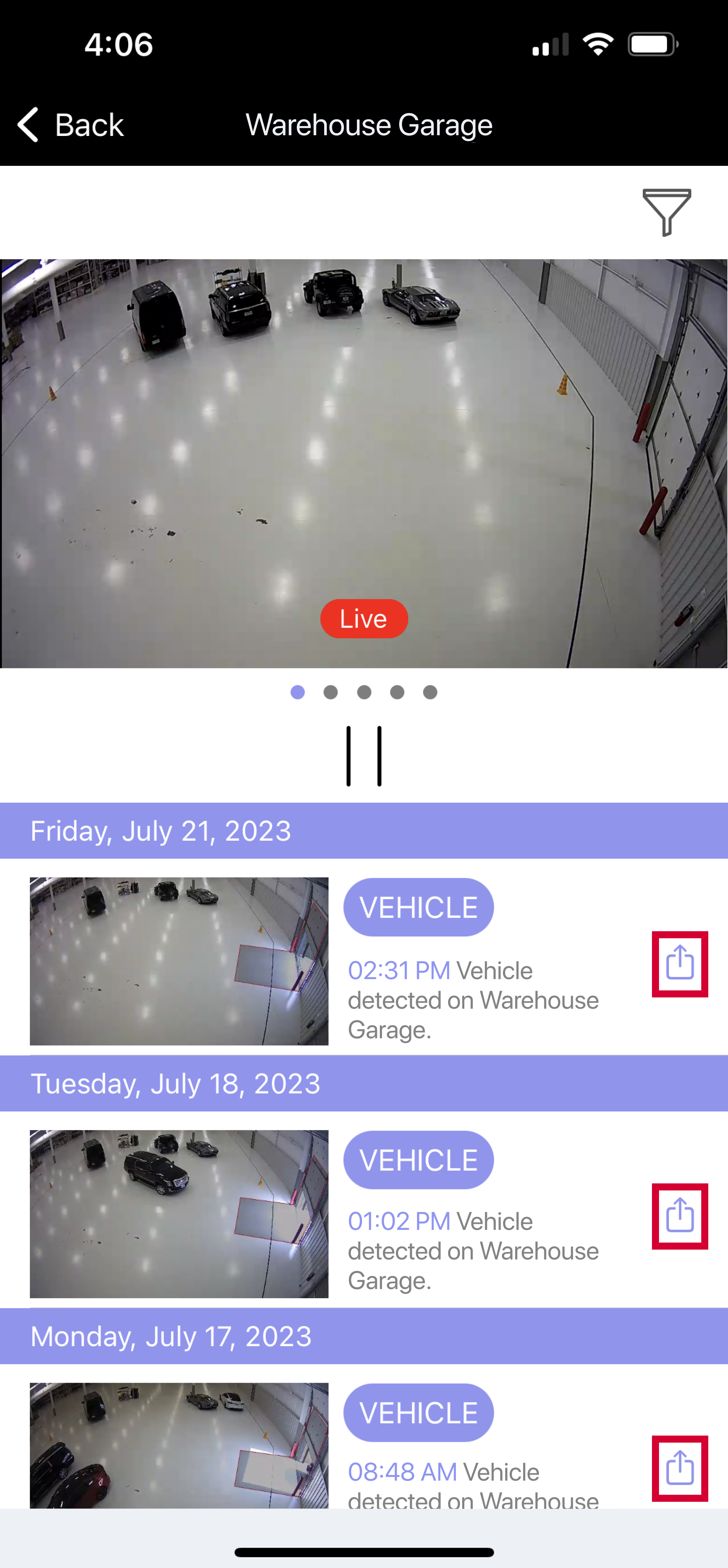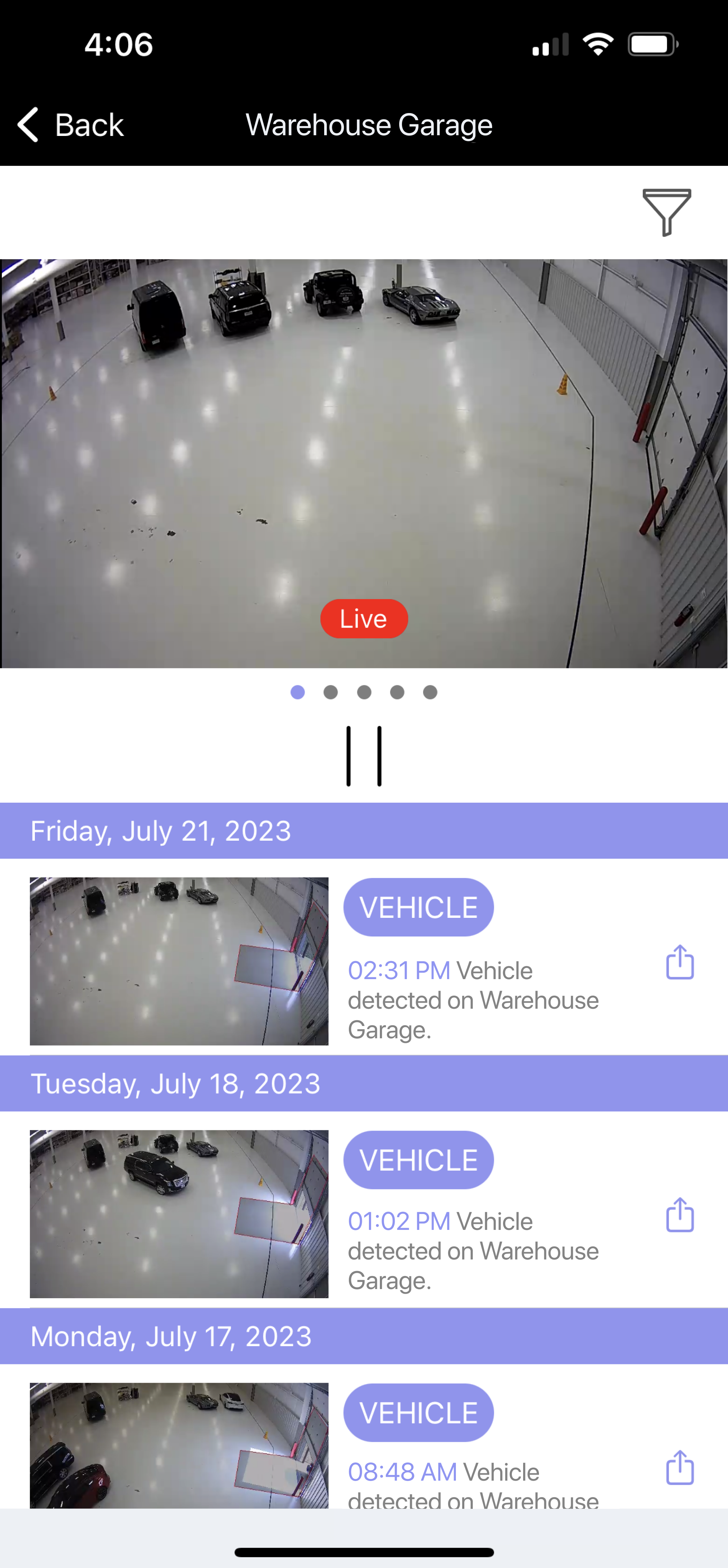 Go to Video, then select a camera from the Video Page to see live video and video clips from a single camera. In this section, you can view live feeds, view event lists of a selected camera, download clips, and filter to a specific time or event type.